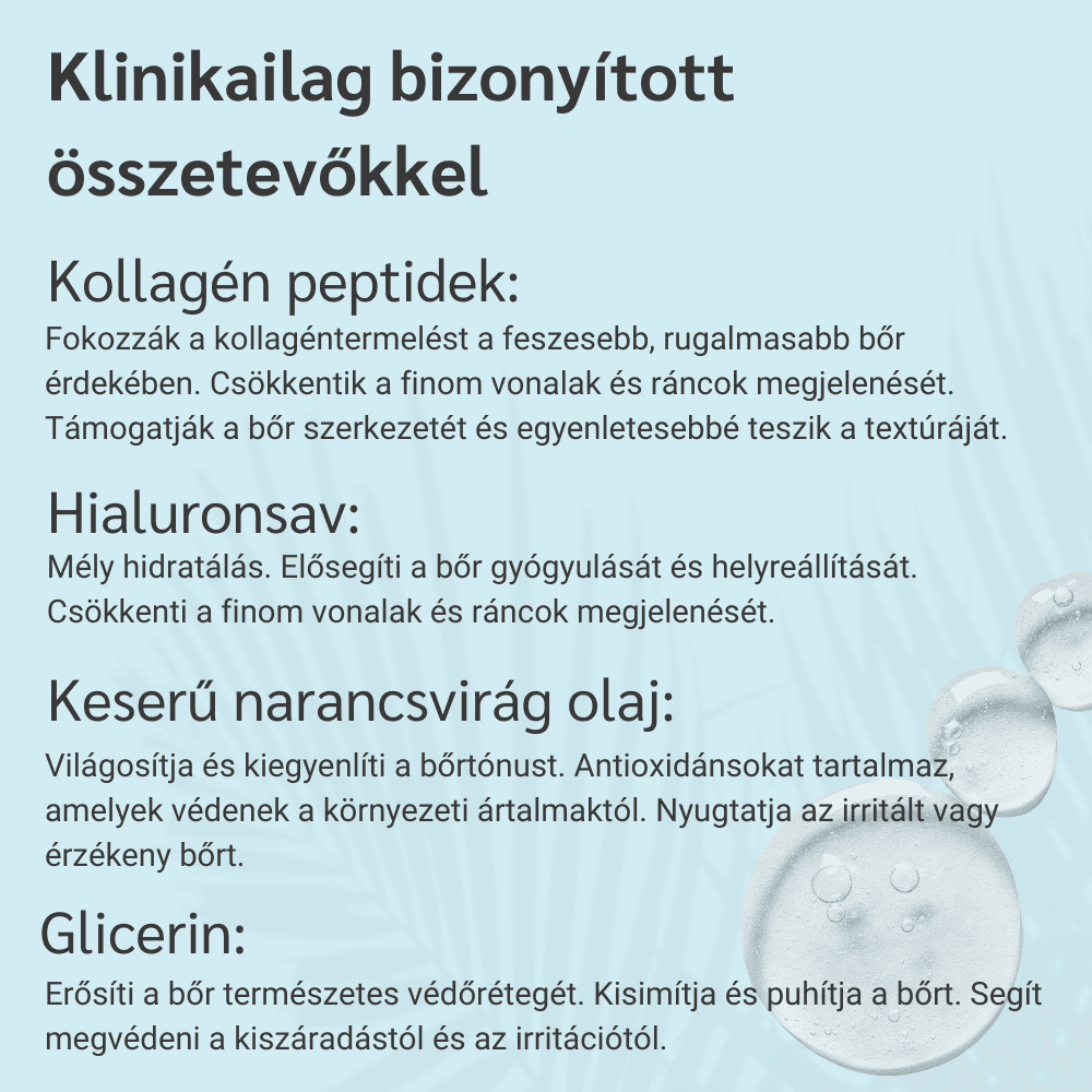 Fokozzák a kollagéntermelést a feszesebb, rugalmasabb bőr érdekében. Csökkentik a finom vonalak és ráncok megjelenését. Támogatják a bőr szerkezetét és egyenletesebbé teszik a textúráját.